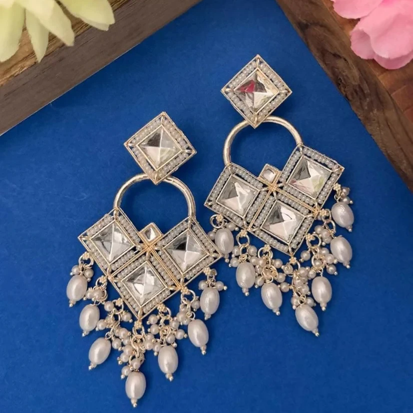 Exude timeless grace with these grand, silver-toned statement earrings. This pair features a rich, fan-shaped stud top meticulously adorned with floral and teardrop Kundan stones.