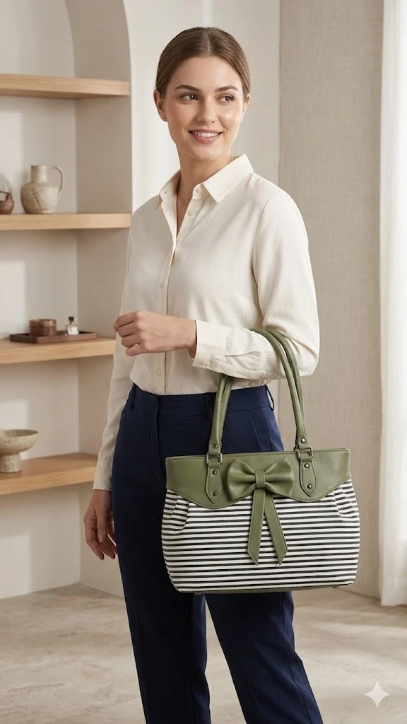 2. Premium Olive Accents: The top panel, sturdy dual handles, and signature bow are crafted from high-quality, pebble-textured vegan leather in a rich olive green.