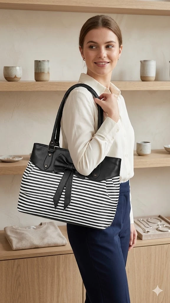 Sleek Onyx Accents: The top yolk, reinforced handles, and center bow are crafted from premium, smooth black vegan leather, providing a luxurious textural contrast to the canvas body.