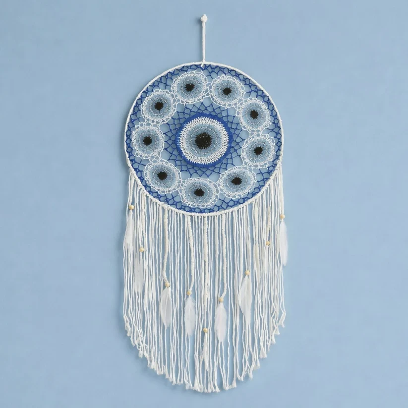 Enhance your home décor with this beautifully handcrafted dream catcher wall hanging. Designed with intricate woven patterns and elegant feather tassels, this decorative piece brings a calming and artistic vibe to any space. Inspired by traditional dream catcher designs, it symbolizes protection and positive energy while adding a stylish bohemian touch to interiors. Perfect for bedrooms, living rooms, meditation areas, or cafés, this wall hanging serves as both a decorative accent and a meaningful décor element.