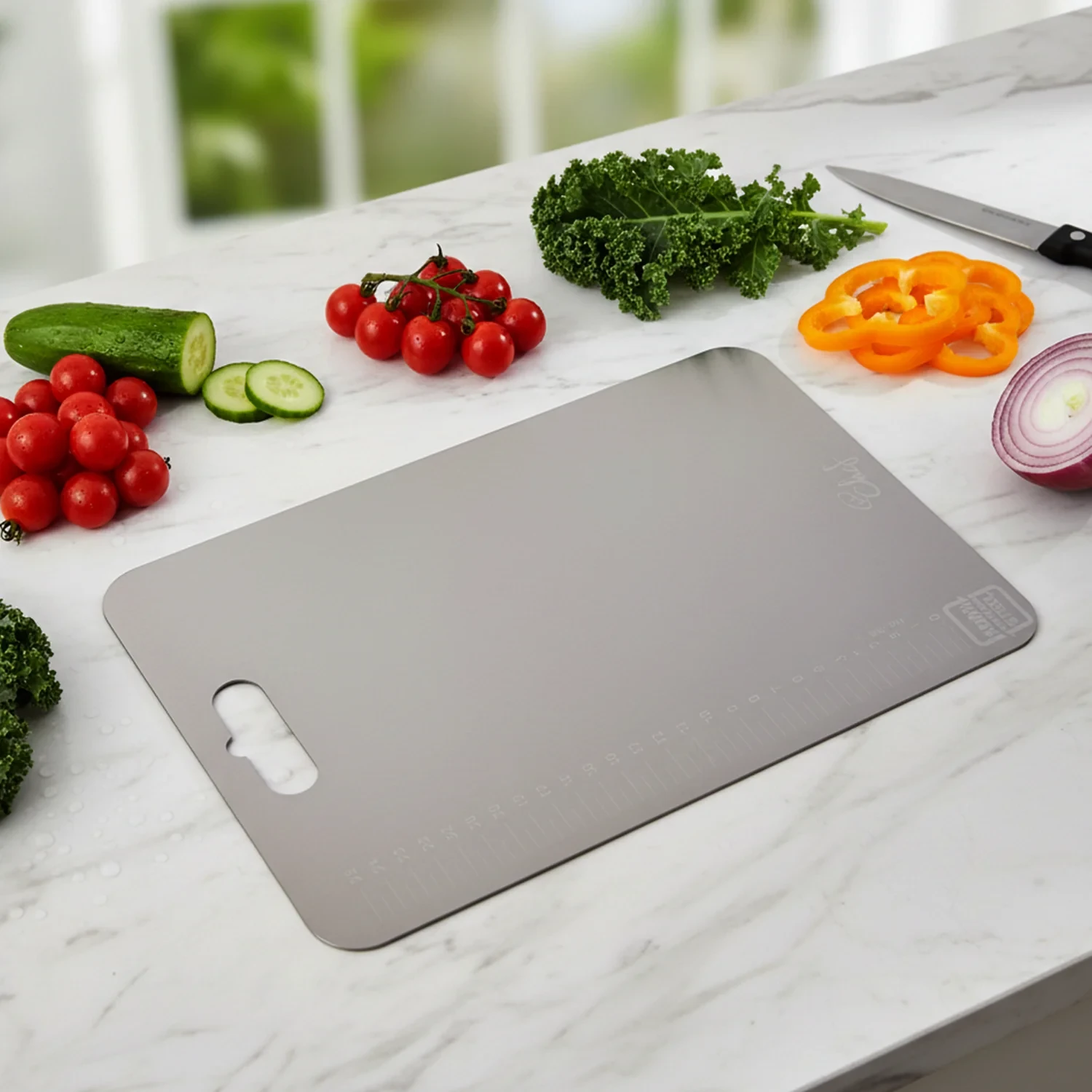 Upgrade your daily kitchen prep with this premium Stainless Steel Cutting Board, designed for clean, hygienic, and mess-free chopping. Unlike traditional wooden or plastic boards, this steel chopping board helps reduce odor retention and makes cleaning quick and easy after every use. The smooth flat surface provides a stable area for slicing vegetables, fruits, and other ingredients while maintaining a neat cooking space. It also comes with an easy-grip handle cut-out, making it convenient to lift, carry, and store. The built-in measurement scale helps you cut and prepare ingredients with better accuracy for cooking and baking. Perfect for modern kitchens, this board is a smart choice for daily cooking, meal prep, and healthy food preparation routines.