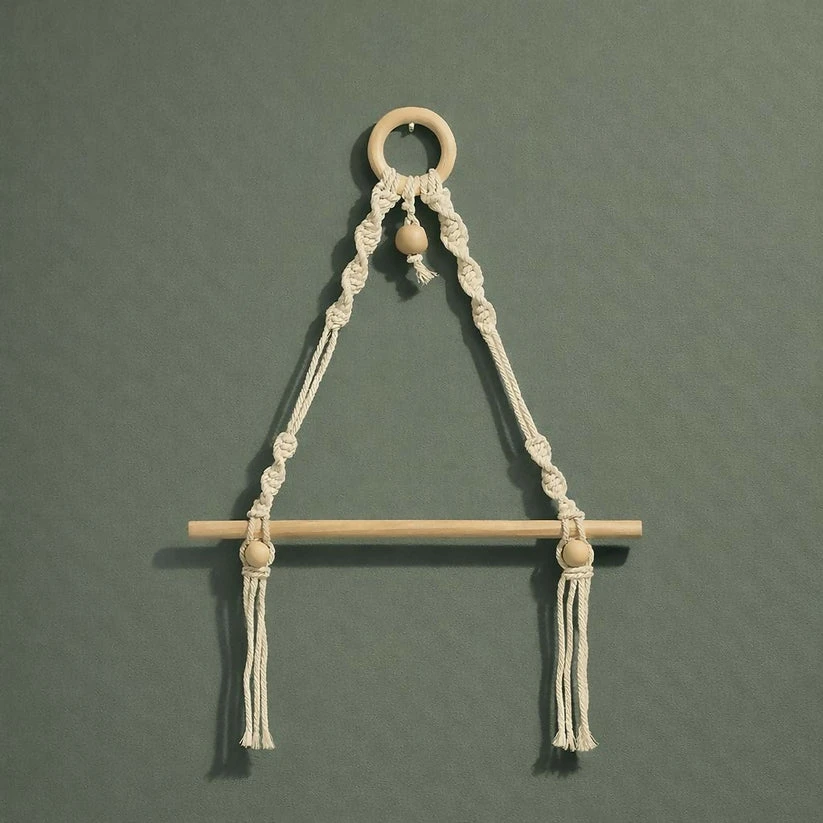 Add a natural and stylish accent to your home décor with this beautifully crafted macrame hanging shelf. Designed with strong cotton rope and a sturdy wooden rod, this decorative wall piece combines bohemian charm with practical functionality. The elegant macrame knots and wooden bead details create a warm handmade aesthetic that enhances any wall space. Ideal for displaying small plants, decorative items, or lightweight accessories, this hanging shelf is perfect for living rooms, bedrooms, balconies, or office décor.