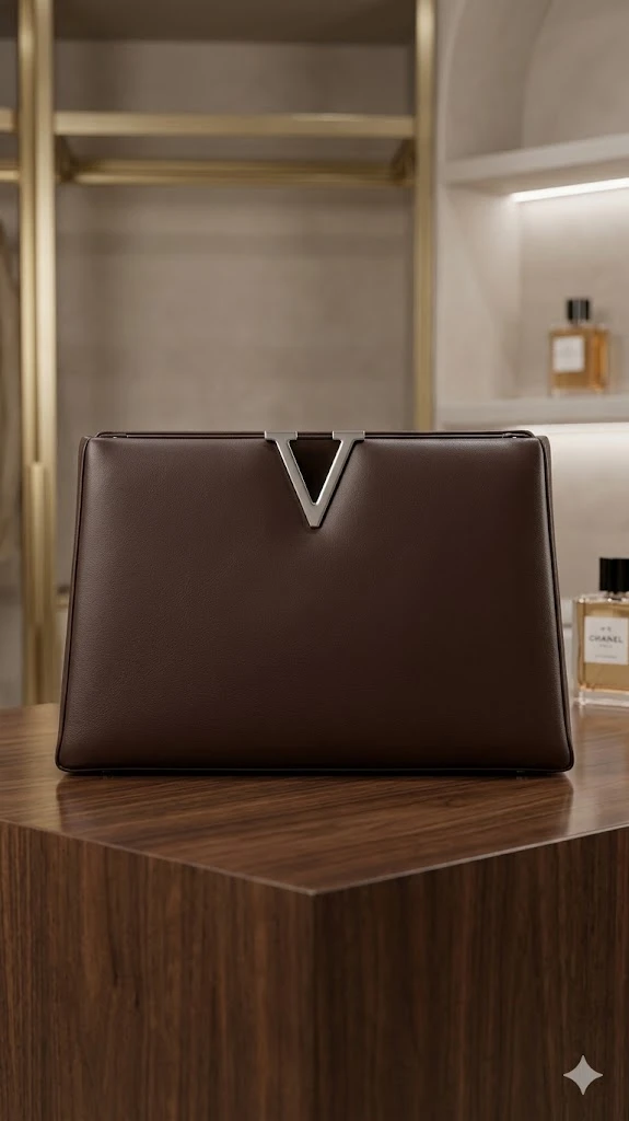 2. Sculpted Silver "V" Hardware: The focal point is a sharp, polished silver "V" emblem recessed into the top frame. This high-shine metallic detail provides a cool, modern contrast to the warm, dark tones of the bag.