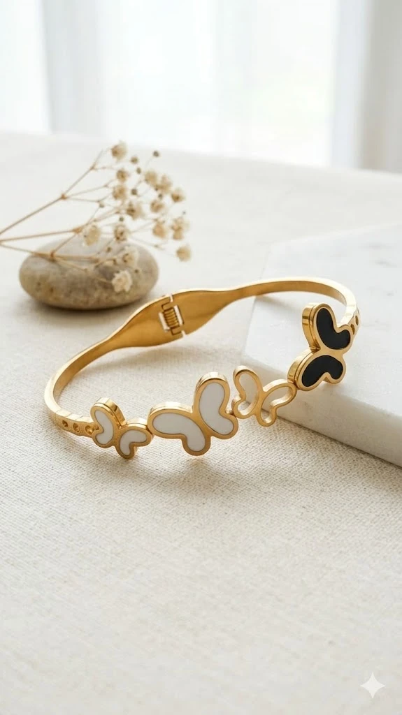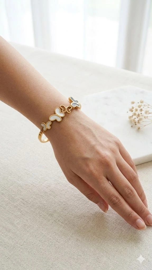 Dynamic Motif: A graduating row of butterflies creates a "fluttering" effect across the wrist. The mix of open-work outlines and solid inlays adds a unique architectural depth to the piece.