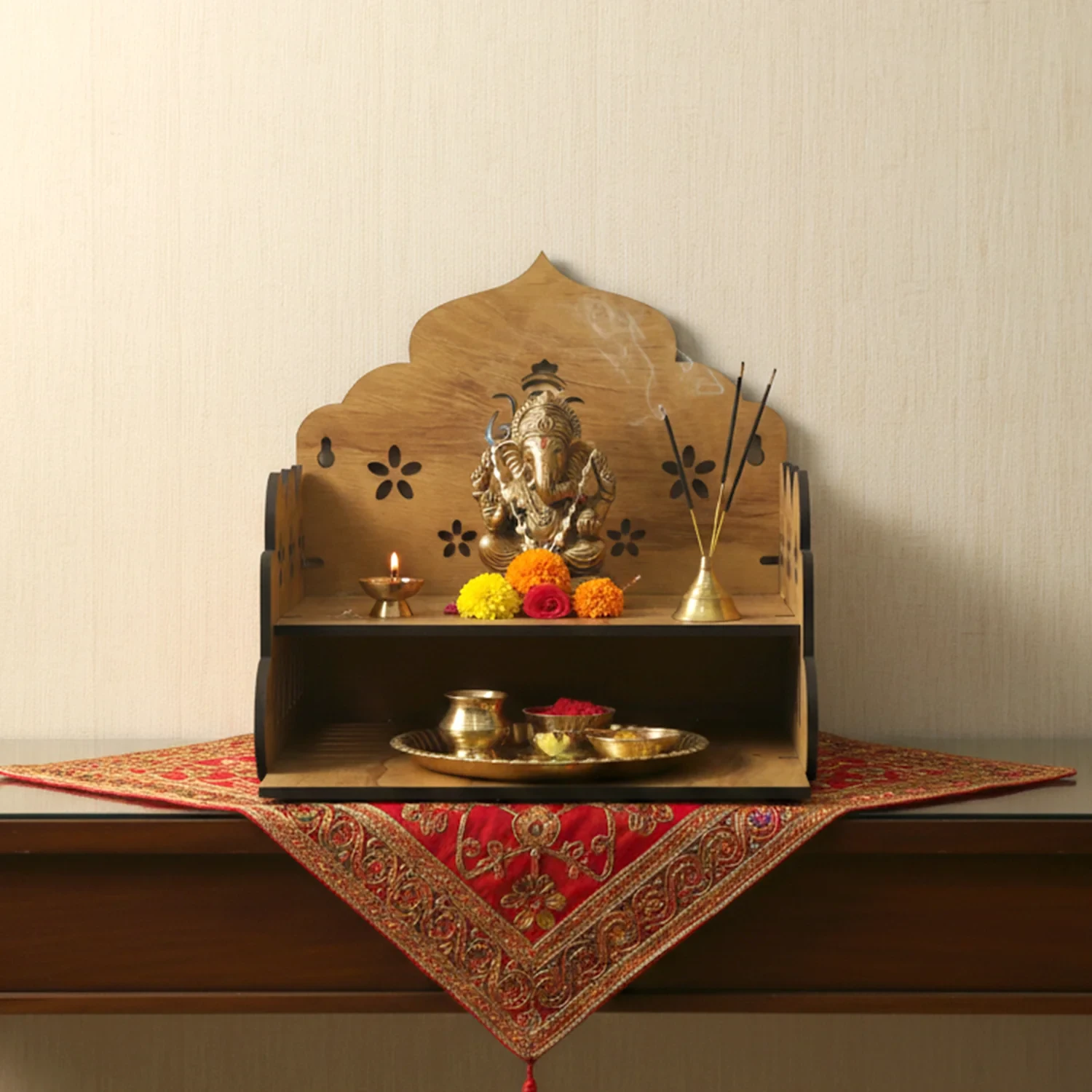 Bring a peaceful and spiritual atmosphere into your home with this beautifully designed tabletop wooden mandir. Crafted in a traditional temple-style shape with a decorative Lord Ganesha design on the back panel, this compact pooja stand is perfect for daily prayers and festive worship setups. The mandir features a spacious top platform for placing idols, diya, incense holder, flowers, and small pooja essentials. It also includes a lower open shelf area which can be used for keeping pooja thali, matchbox, incense packets, kumkum container, or other prayer accessories. Its space-saving design makes it ideal for placing on a table, cabinet, wall shelf, or corner altar space. A perfect choice for home temples, office prayer corners, gifting, and festive decoration.