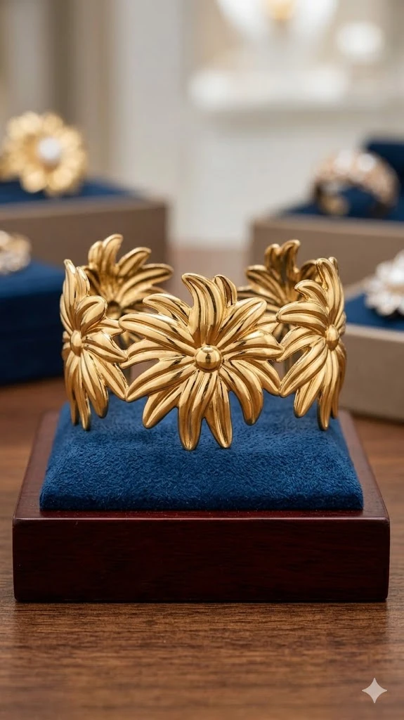 Sculptural Design: Featuring a repeated "Sunburst" or "Sunflower" motif with high-relief detailing for a luxurious, heavy-gold look.
