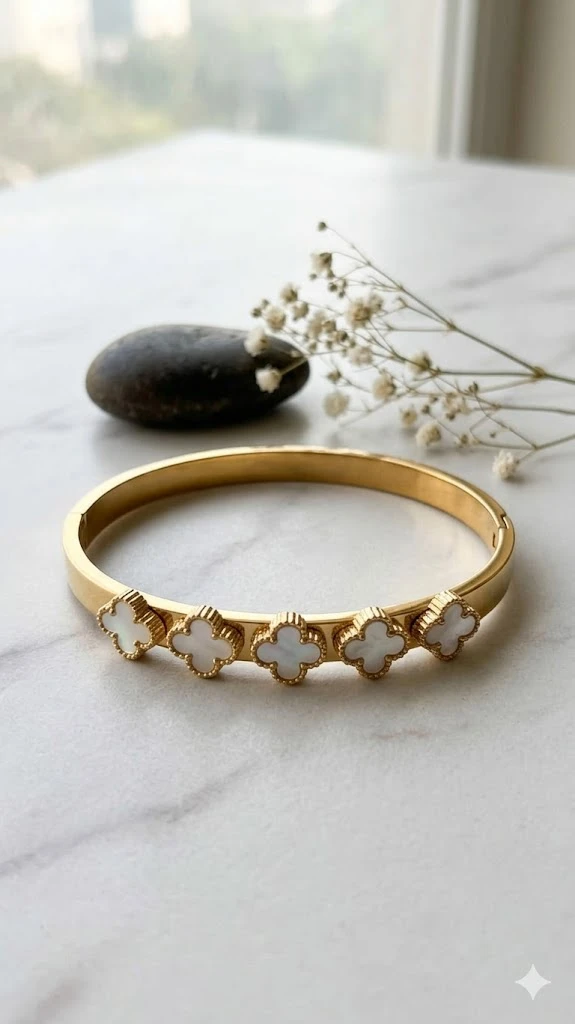 Sequential Clover Design: The face of the bangle is adorned with five identical clover charms. This repetition creates a high-impact, luxury aesthetic that wraps beautifully around the wrist.
