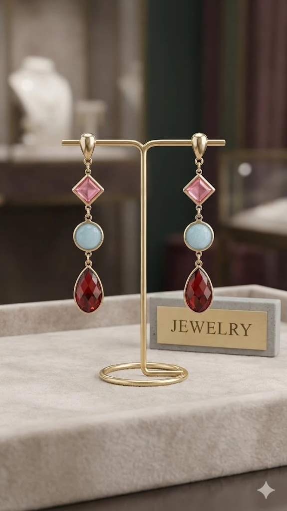 Design: A whimsical four-tier vertical arrangement. The design features a polished gold teardrop stud, a hot pink diamond-cut square, a serene sky-blue circular cabochon, and a dramatic deep ruby-red faceted teardrop.