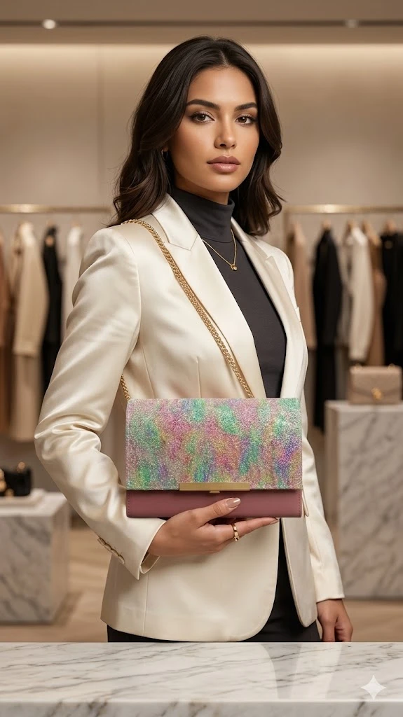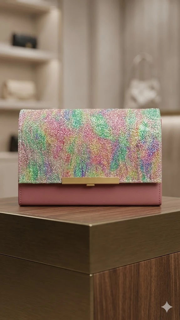 2. Minimalist Gold Bar Detail: The sleek, horizontal gold-tone bar closure provides a modern, high-end finish that balances the vibrant glitter texture.