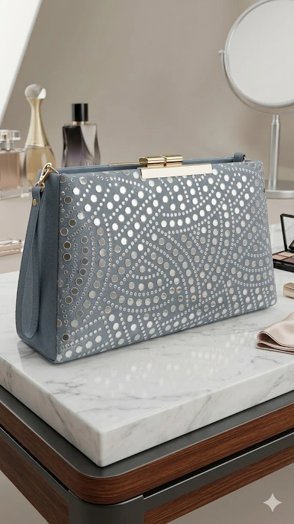 1. Dynamic Embellishment: The front panel is meticulously detailed with a swirling mosaic of silver-tone circular studs and delicate sequins that create a high-shine, textured appearance.