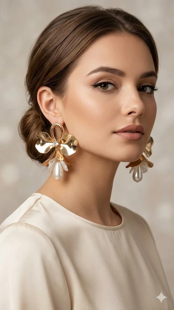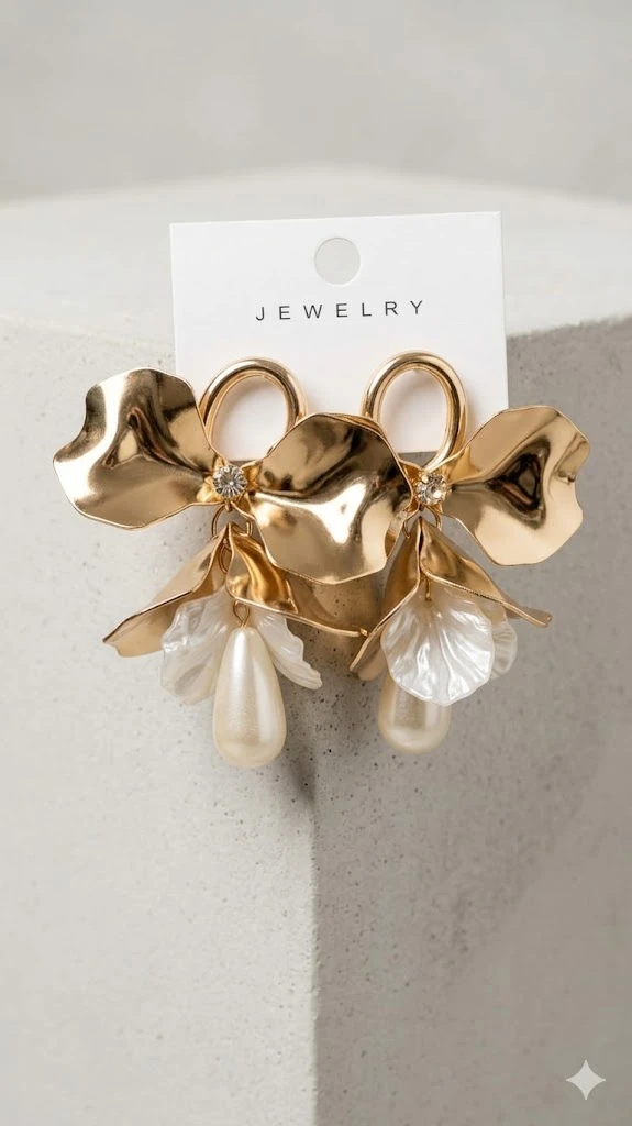 Elegant Accents: Each flower is centered with a shimmering crystal stud, leading down to delicate white resin petals and a lustrous, teardrop-shaped faux pearl.