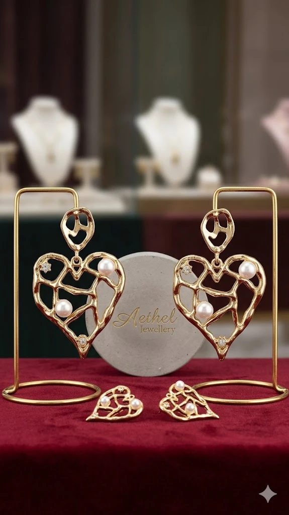 Design: A striking open-work lattice heart with an organic, hand-sculpted feel. The intricate gold-toned "vines" create a delicate web that cradles a series of lustrous white pearls and shimmering crystal accents.