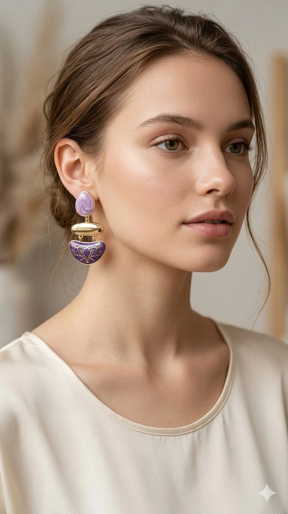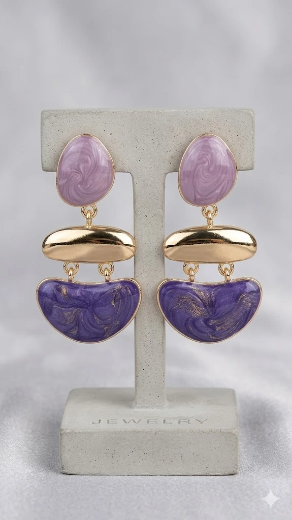 Design: A striking three-tier vertical drop. The design begins with a soft lavender pebble-shaped stud, followed by a polished gold-toned horizontal bar, and concludes with a wide, indigo-purple crescent.