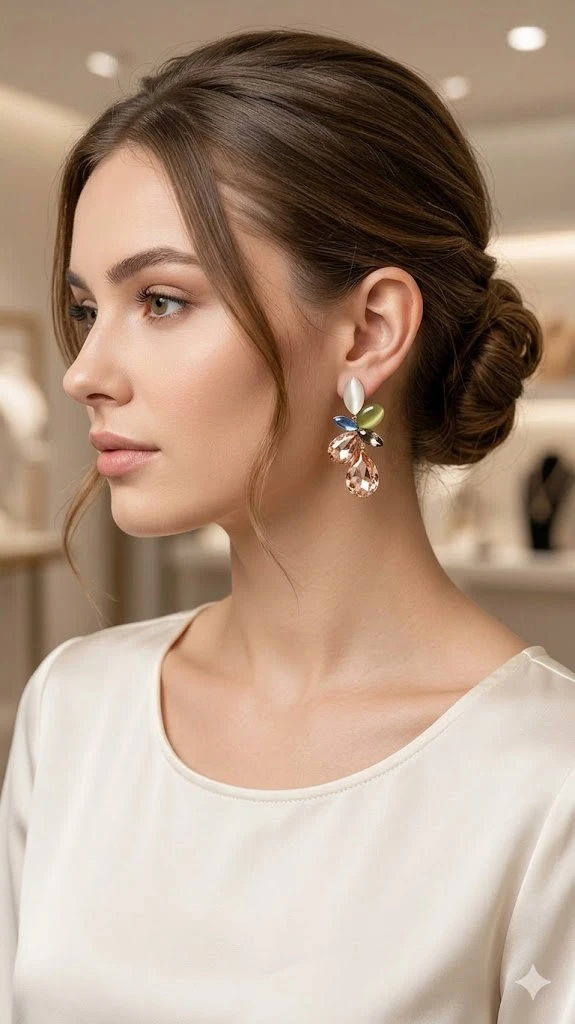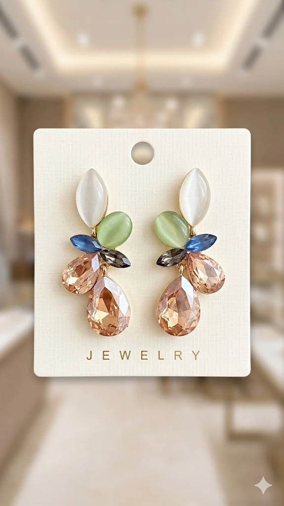 Design: An intricate, leaf-inspired arrangement featuring a diverse collection of stones. The design begins with soft cat-eye ovals in milky white and sage green, accented by a sharp sapphire blue marquise, and cascades into triple-tiered champagne crystal drops.