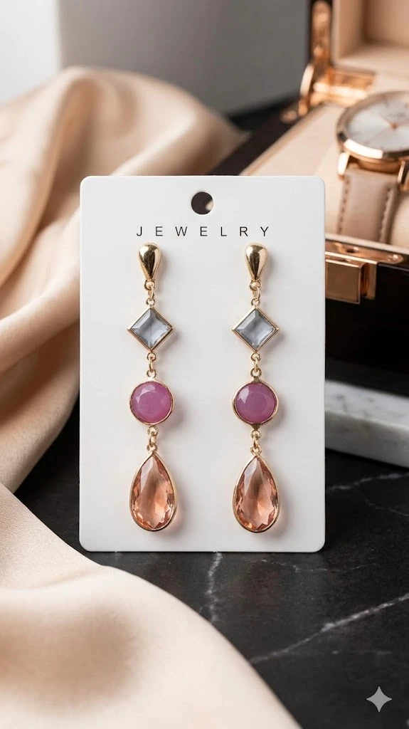 Geometric Trio: A curated combination of a clear diamond-cut stud, a soft lavender circular accent, and a rich champagne teardrop crystal.