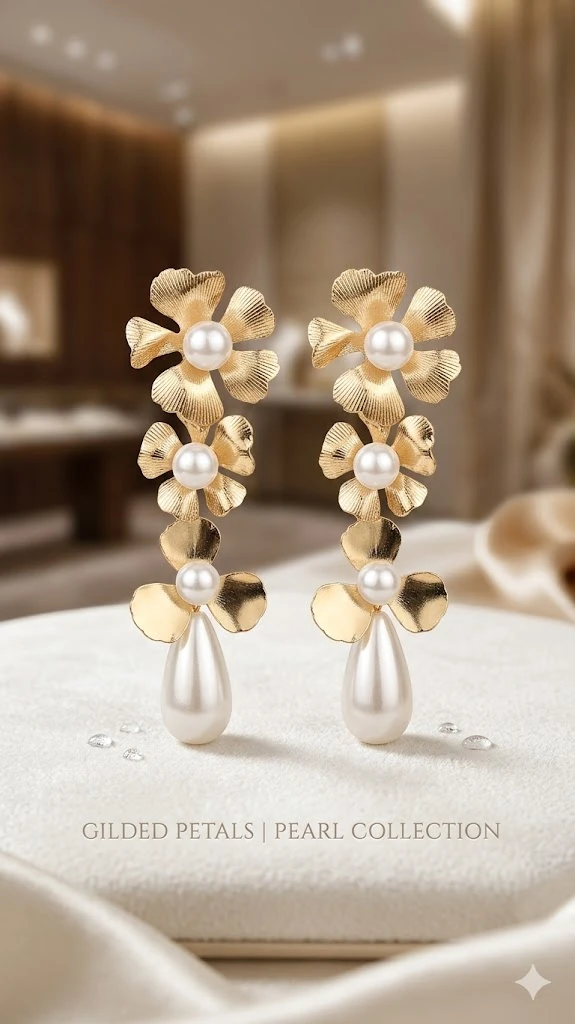 1. Design: A breathtaking triple-tier floral design. Each earring showcases three meticulously crafted gold-toned flowers that "climb" toward the ear, finishing with a dramatic, oversized teardrop pearl for a sophisticated silhouette.