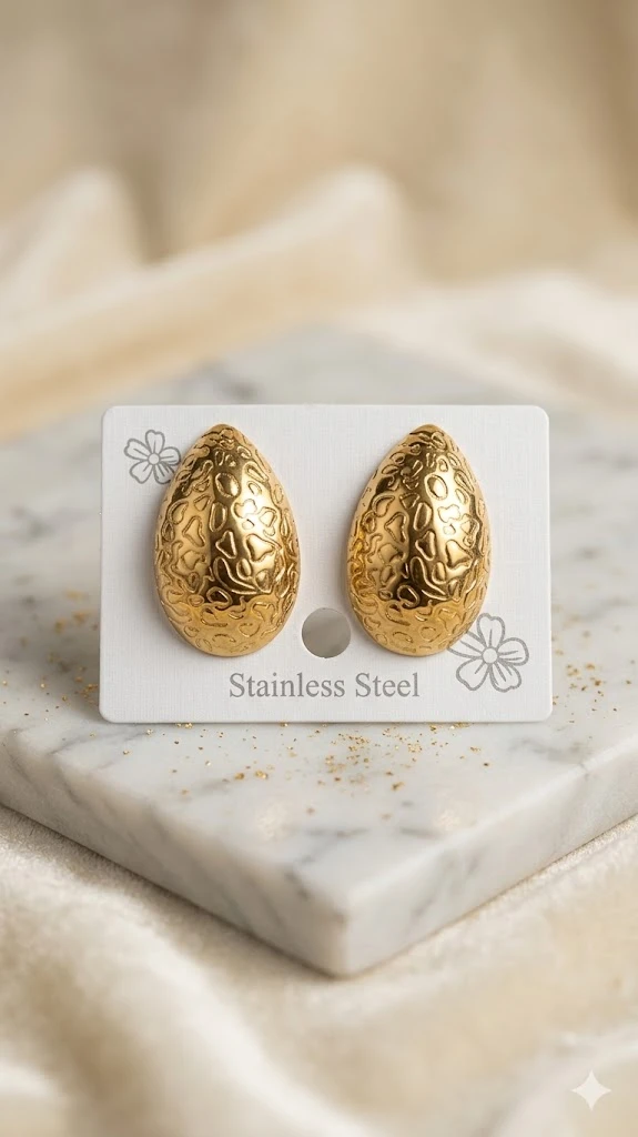 Exotic Embossed Texture: A richly detailed surface that creates a stunning interplay of light and shadow, giving the earrings a handcrafted, high-fashion look.