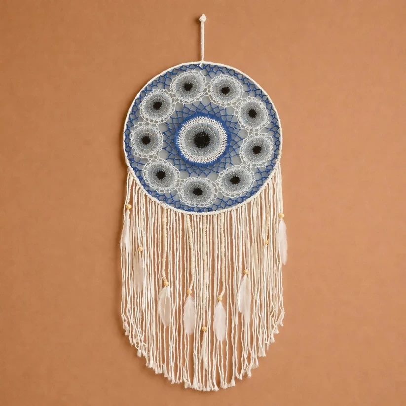 Enhance your home décor with this beautifully handcrafted dream catcher wall hanging. Designed with intricate woven patterns and elegant feather tassels, this decorative piece brings a calming and artistic vibe to any space. Inspired by traditional dream catcher designs, it symbolizes protection and positive energy while adding a stylish bohemian touch to interiors. Perfect for bedrooms, living rooms, meditation areas, or cafés, this wall hanging serves as both a decorative accent and a meaningful décor element.