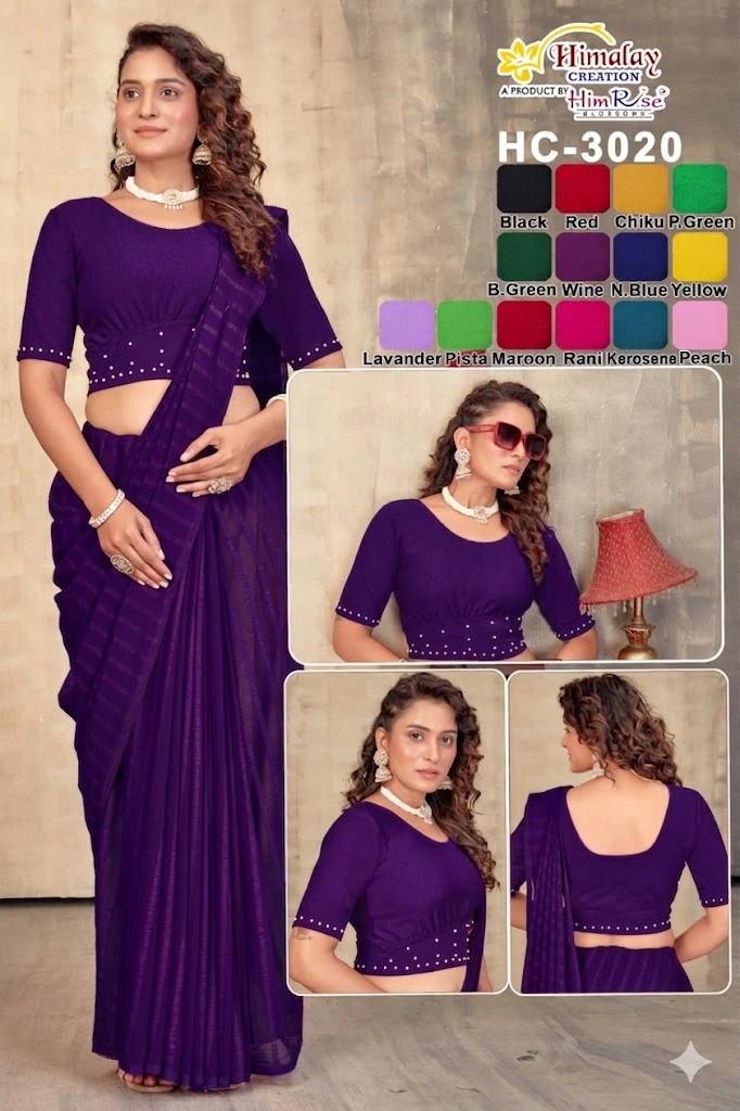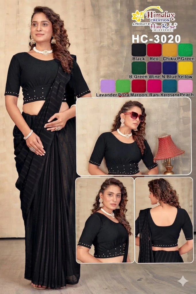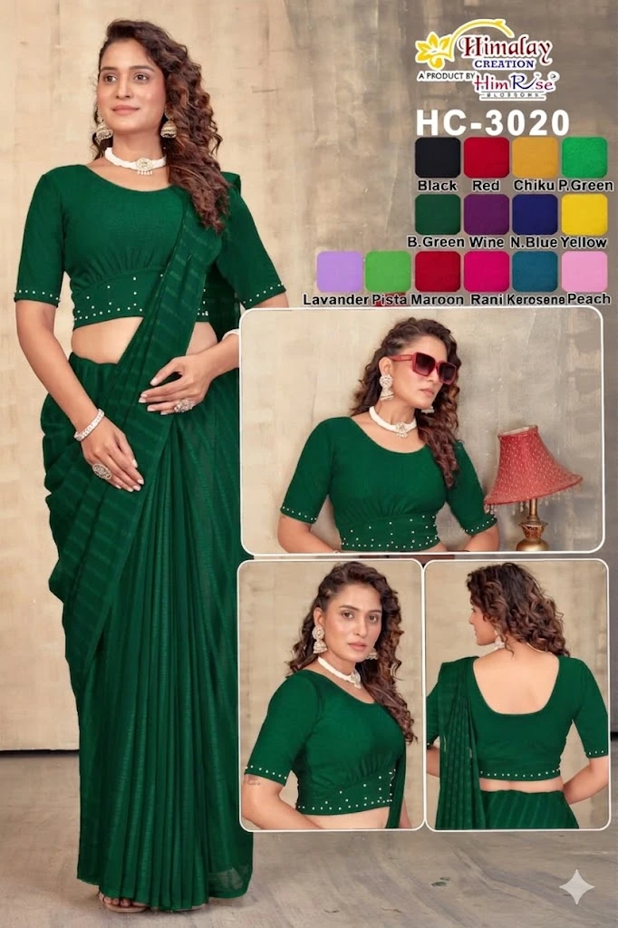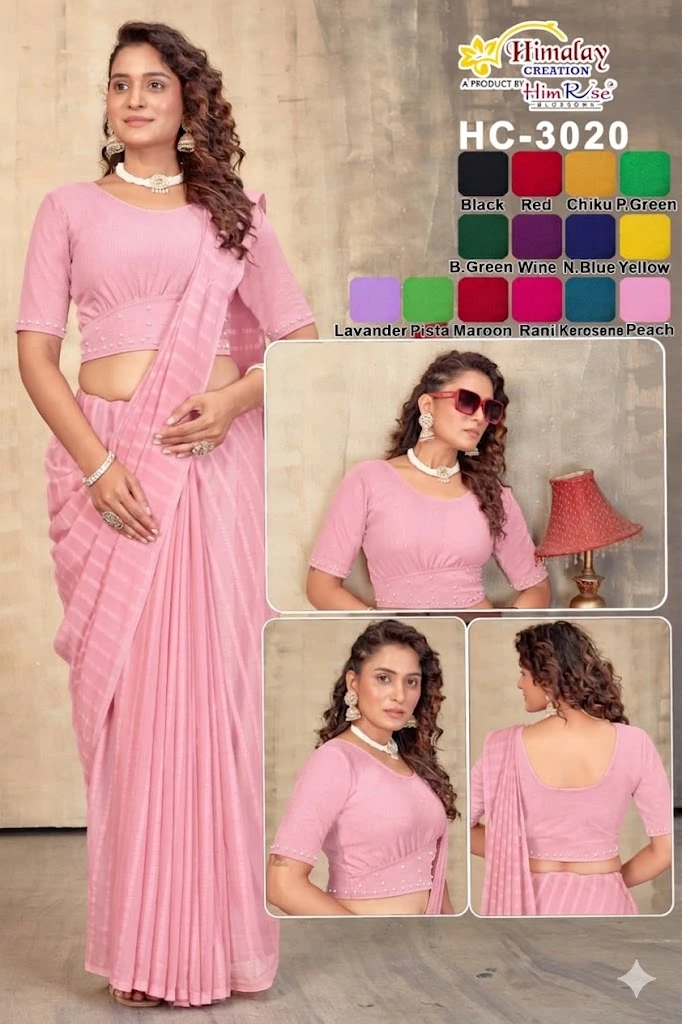 2. The Saree: The ensemble includes a matching chiffon-textured saree with subtle horizontal self-stripes. The lightweight, flowing fabric allows for an elegant drape, perfectly complementing the structured fit of the blouse.