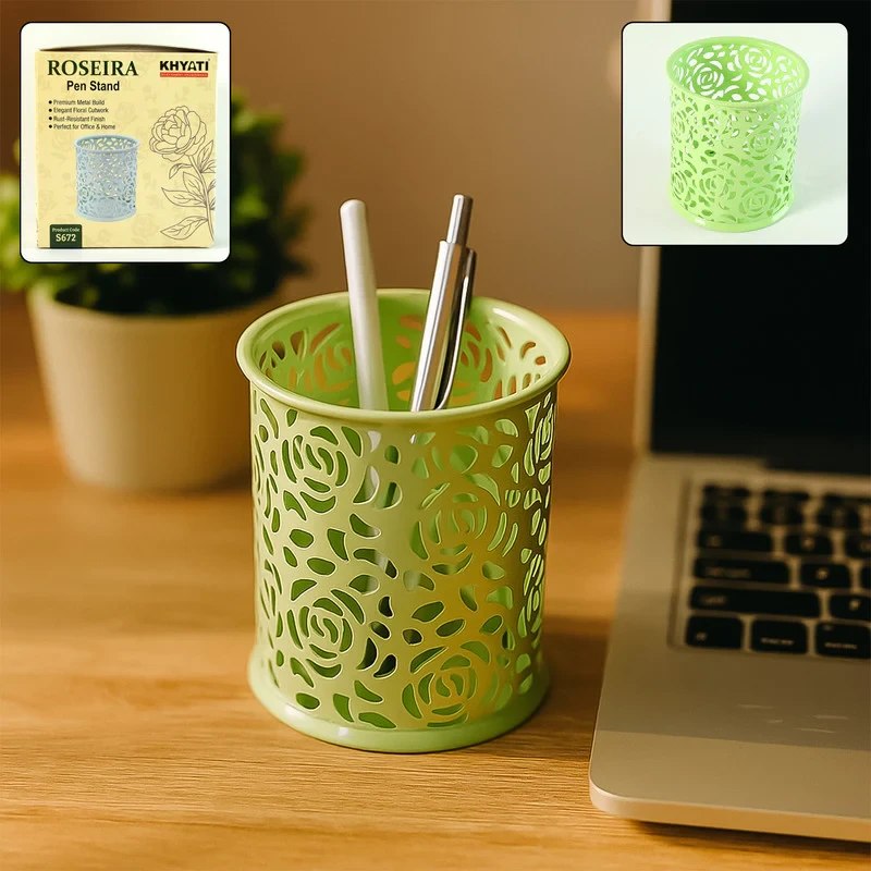 The Khyati Roseira Pen Stand combines elegance with functionality, featuring a delicate floral cutwork design crafted from durable metal. Its open structure adds a decorative touch while keeping your desk essentials like pens, pencils, markers, and scissors neatly organized. The rust-resistant coating ensures long-lasting shine and durability, making it a perfect addition to both modern and traditional workspaces. Compact yet stylish, it enhances the beauty of any office desk, study table, or home workspace.