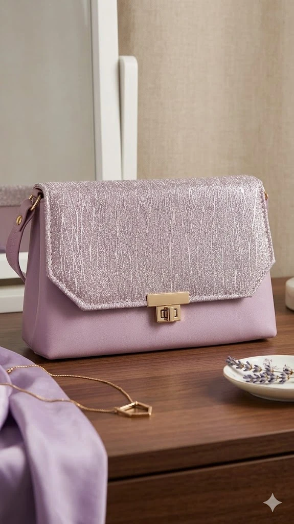 The Flap: The bag's centerpiece is its uniquely textured shimmer-finish flap. Featuring an organic, wood-grain or vein-like pattern in a brilliant metallic lavender, it provides a striking visual and tactile contrast to the smooth body.