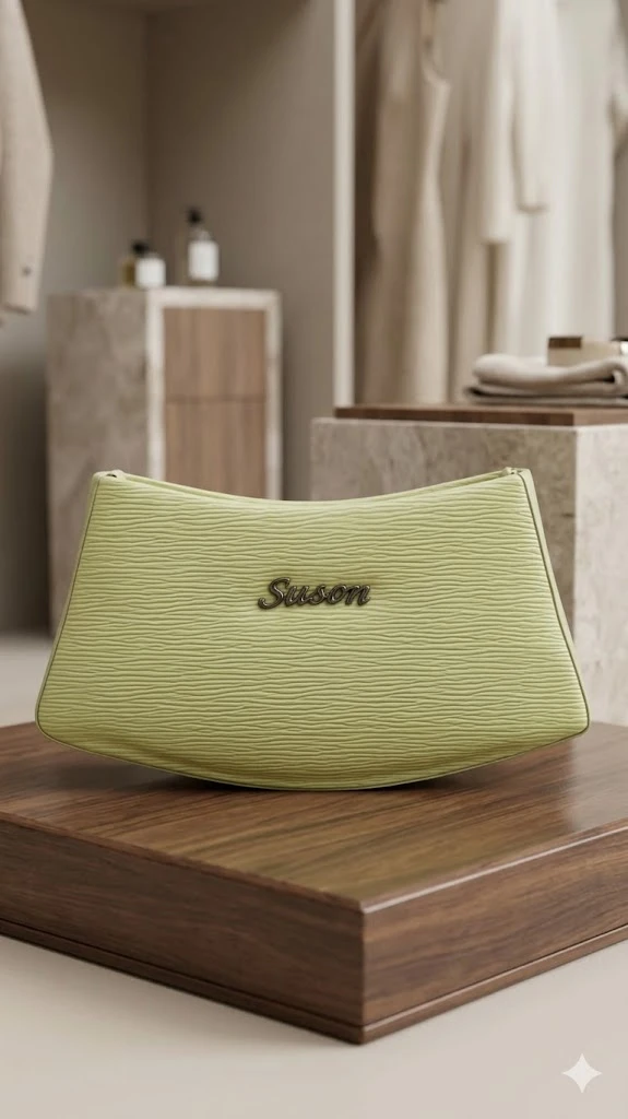 2. Polished Gunmetal Script: Centered on the front is a refined, dark gunmetal-tone "Suson" emblem in a fluid script. The dark hardware provides a sharp, modern contrast to the bright lime exterior.