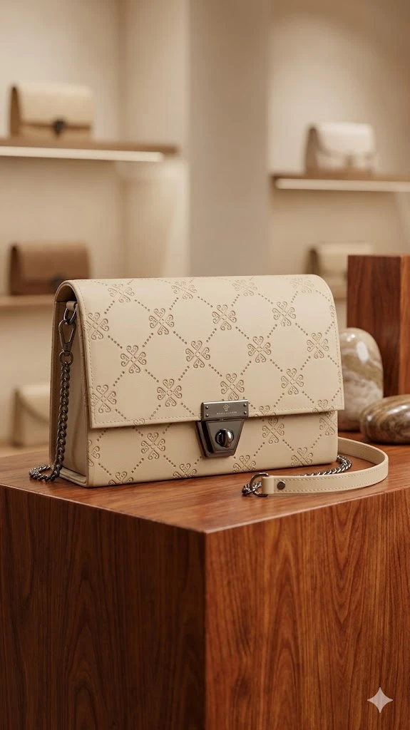 2. Architectural Hardware: Secured with a custom-engineered gunmetal twist-lock clasp that adds a bold, industrial edge to the soft beige palette.