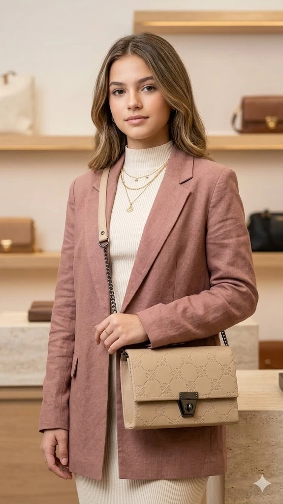 5. Dual-Finish Strap: Features a coordinated beige strap with gunmetal chain accents, providing both comfort and a touch of jewelry-like shine.