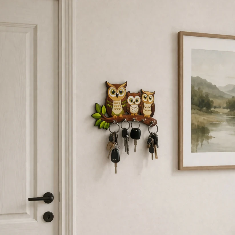 Add charm and functionality to your space with this stylish owl design wooden key holder. Made from high-quality MDF with a smooth printed finish, this wall-mounted key hanger comes with 5 sturdy hooks to keep your keys organized. Perfect for home, office, or entryway décor, it combines utility with a decorative look. Easy to install and durable, this key holder is ideal for daily use while enhancing your wall aesthetics.