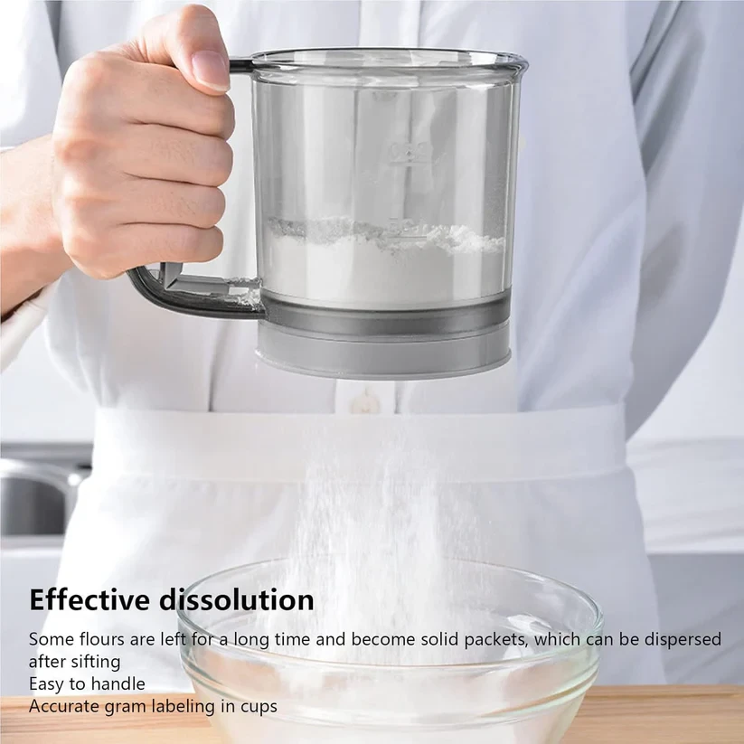 plastic flour sieve cup, flour sifter with handle, fine mesh flour filter, kitchen baking sieve, baking ingredient sifter, handheld flour sifter, durable plastic sieve, powdered flour filter, easy use baking sieve, small flour sifter cup, home baking tool, lightweight kitchen sifter, fine mesh kitchen filter, manual flour strainer, multipurpose baking sieve, portable flour sifter, pastry flour filter