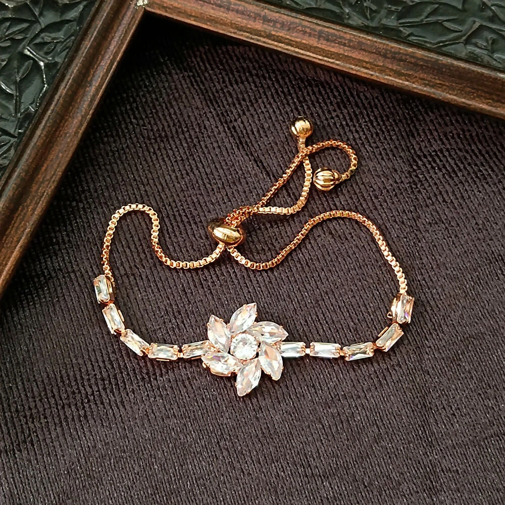 This Rose Gold Plated Ad Stone Adjustable Bracelet exemplifies refined craftsmanship with delicately arranged Ad stones that catch the light softly. The warm rose gold plating adds a luxurious finish, while the adjustable design ensures a personalized and comfortable fit, making it a versatile accessory for both casual and elegant occasions.