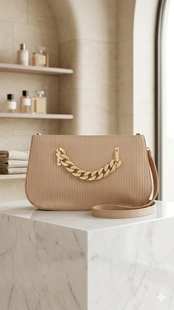 Crystal-Inlaid Gold Chain: The centerpiece of this design is a chunky, gold-tone curb chain draped across the front. Each link is meticulously inlaid with shimmering crystals, providing a brilliant, jewelry-inspired focal point.