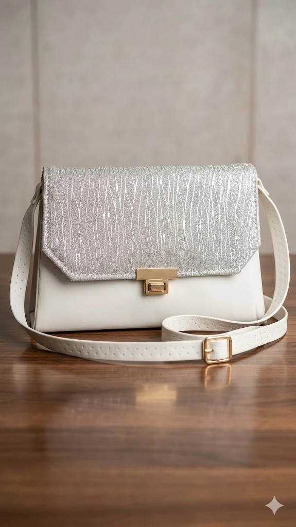 1. Dual-Texture Design: The bag features a striking contrast between a smooth, matte white vegan leather base and a dazzling silver-glittered top flap.