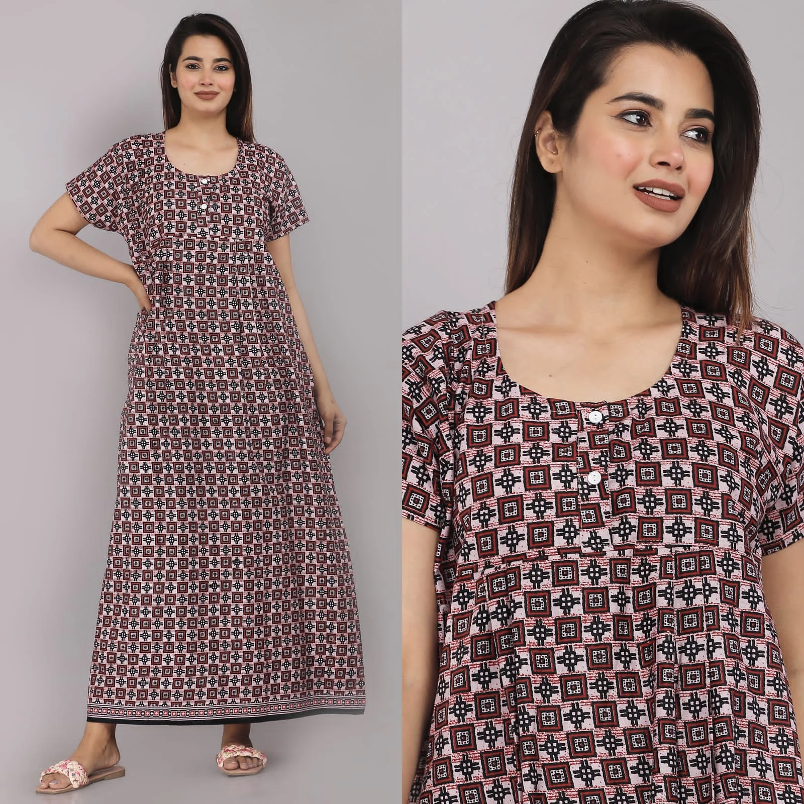 Women's Cotton Printed Full-Length Nighty Short Sleeve Relaxed Fit Nighty for Comfortable Sleep & Lounge Wear
